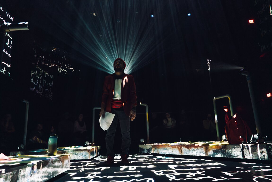 Recommended for ages 13+. Some explicit language. Mention of suicidal ideation, mental illness, and grief. Flash and video motion warning. The immersive installation includes prominent sound, light and video projection directly on the audience. May not be recommended for individuals experiencing motion sickness and those sensitive to light and sound. Also includes water-based haze & audience on stage with actor.