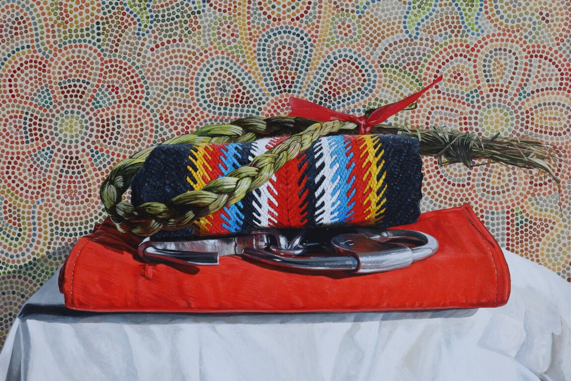 Reading the Ruins, includes new paintings featuring NWMP-era artefacts from the holdings of University of Calgary's Archives & Special Collections. The re-contextualized paramilitary artefacts are also displayed.